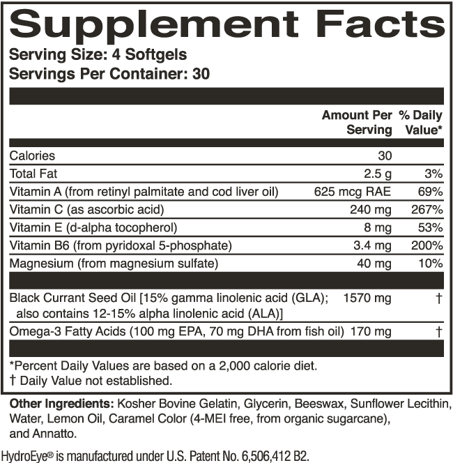 HydroEye is a patented nutritional formulation that works from the inside out to provide continuous support for dry, itchy eyes. HydroEye, clinically found to promote dry eye comfort in peer reviewed research, delivers a proprietary blend of GLA: the dry eye omega, plus omega 3 fatty acids (EPA and DHA), plus other key nutrients that work together to support a healthy tear film and soothe the ocular surface.
